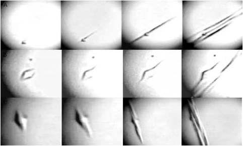 納升滲透壓儀與該公司的光學(xué)重結(jié)晶儀(optical recystallometer) 一起使用,對研究增強各種生物體冷適應(yīng)性具有無限的利用價值。比如,右圖展示了唯有利用納升滲透壓儀才能觀測到的冰晶在抗凍蛋白存在情況下的六邊雙錐的生長情況。